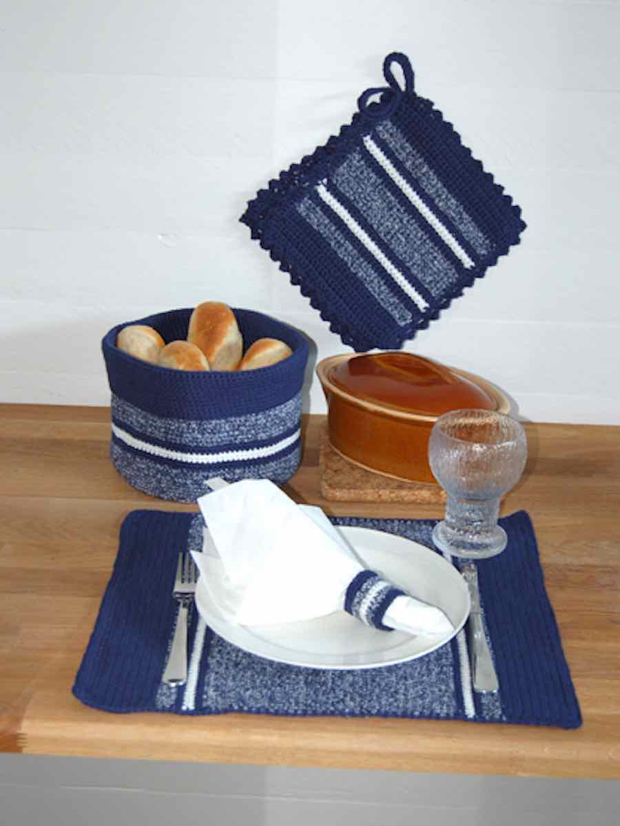 Dækkeservietter, grydelapper, servietringe og brødkurve hækles i bomuldsgarn med fastmasker, luftmasker og kædemasker. Mønstrene hækles i striber og former, nogle med dobbelt garn. Perfekte begynderprojekter med praktisk anvendelse.