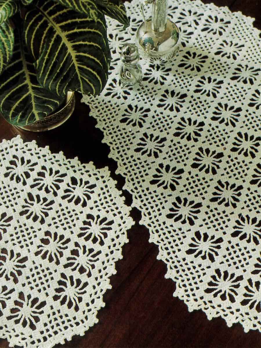 Dugen og løberen hækles med stangmasker, luftmasker og picotmasker som beskrevet. Start med en ring af luftmasker og opbyg arbejdet række for række efter mønsteret. Følg diagrammet nøje for form og hulmønster. Afslut med kantrækker.