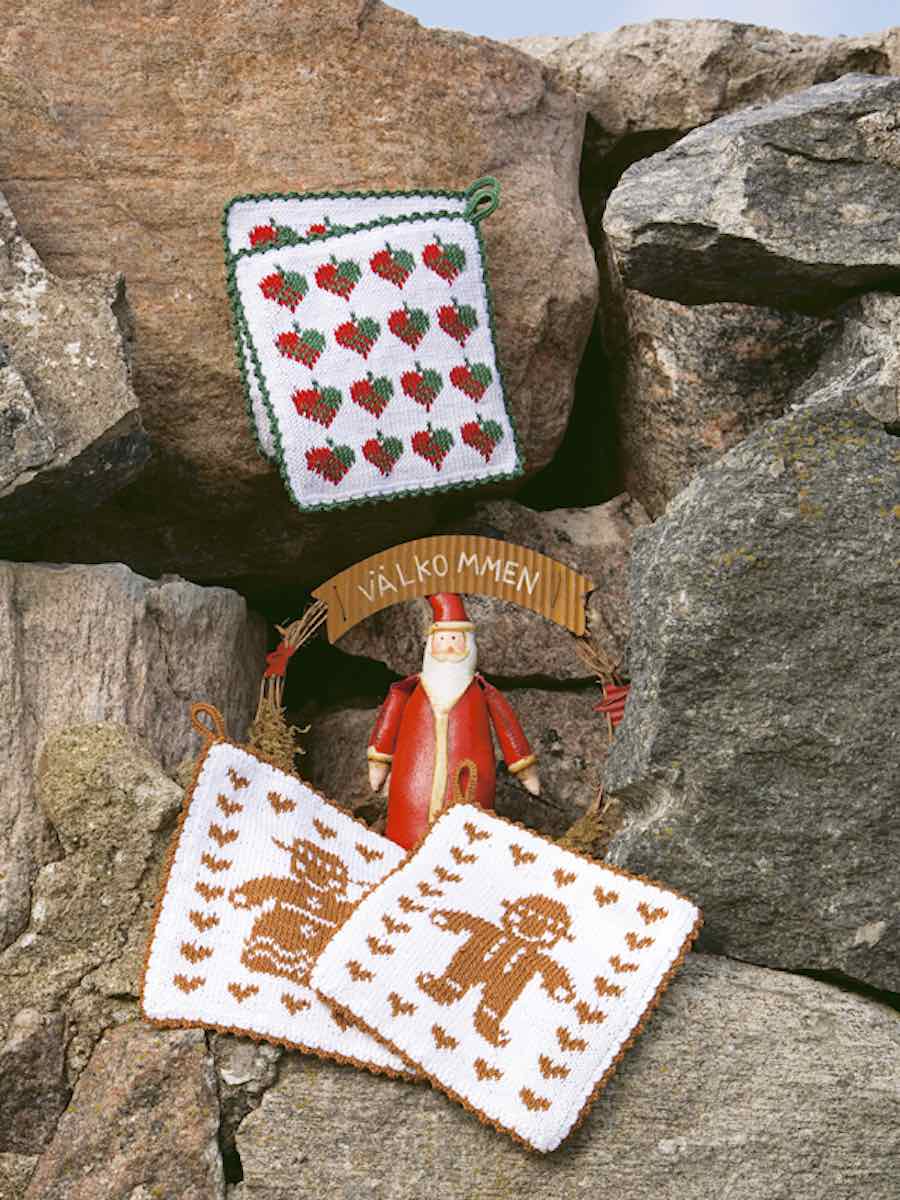Strik grydelapper med peberkager eller hjerter i merceriseret bomuld. Følg diagrammet i glatstrik, fold dobbelt og hækl sammen med fastmasker. Afslut med en dekorativ kant og hank.