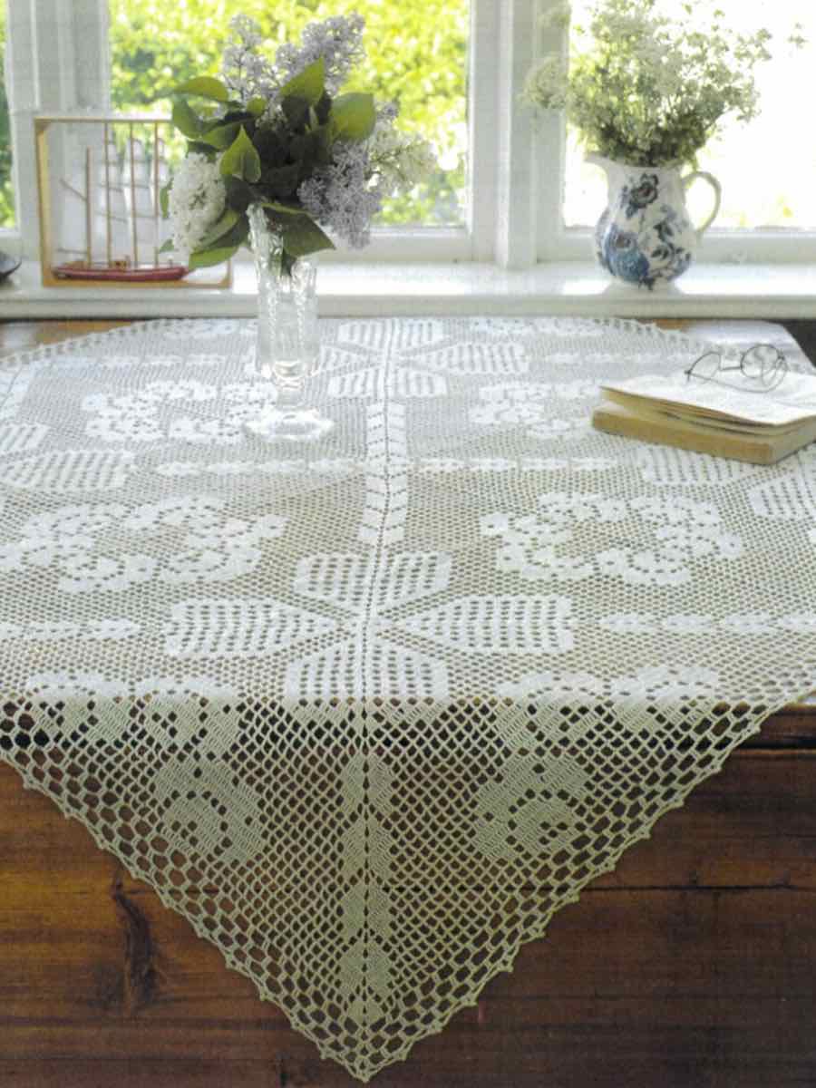 Dette hæklede dugmønster i firkanter hækles fra en central cirkel og bygger op til et blondelignende hjertemotiv. Du bruger dobbeltmasker, luftmasker, picotmasker og dobbeltmasker og følger et detaljeret diagram.