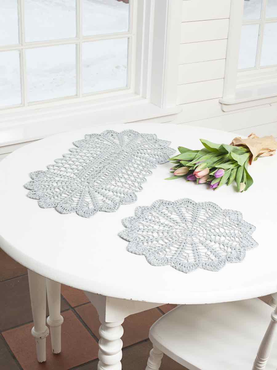 Hækl en dug eller løber i merceriseret bomuld med luftmasker, stangmasker og stangmasker/tredobbeltmasker efter diagrammet. Start i midten med en ring af lm, fortsæt rundt med mønsterrækker og tag ud jævnt fordelt.