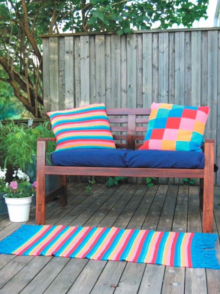 Tæppe og puder hæklet i farverige striber og firkanter med enkeltsting i bagerste maskeled, hvilket giver en tæt og slidstærk struktur. Tæppet hækles på langs med flere farveskift, mens puderne hækles i strimler eller firkanter, der sys sammen. Arbejdet afsluttes med frynser og lynlås.