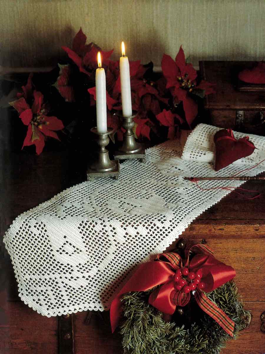 Hækl løberen i omgange med stangmasker og luftmaskebuer efter mønsteret. Tag ind i begyndelsen og slutningen af omgangene, hvor firkanten bliver smallere. Afslut med en kant af fastmasker rundt om hele stykket for stabilitet.