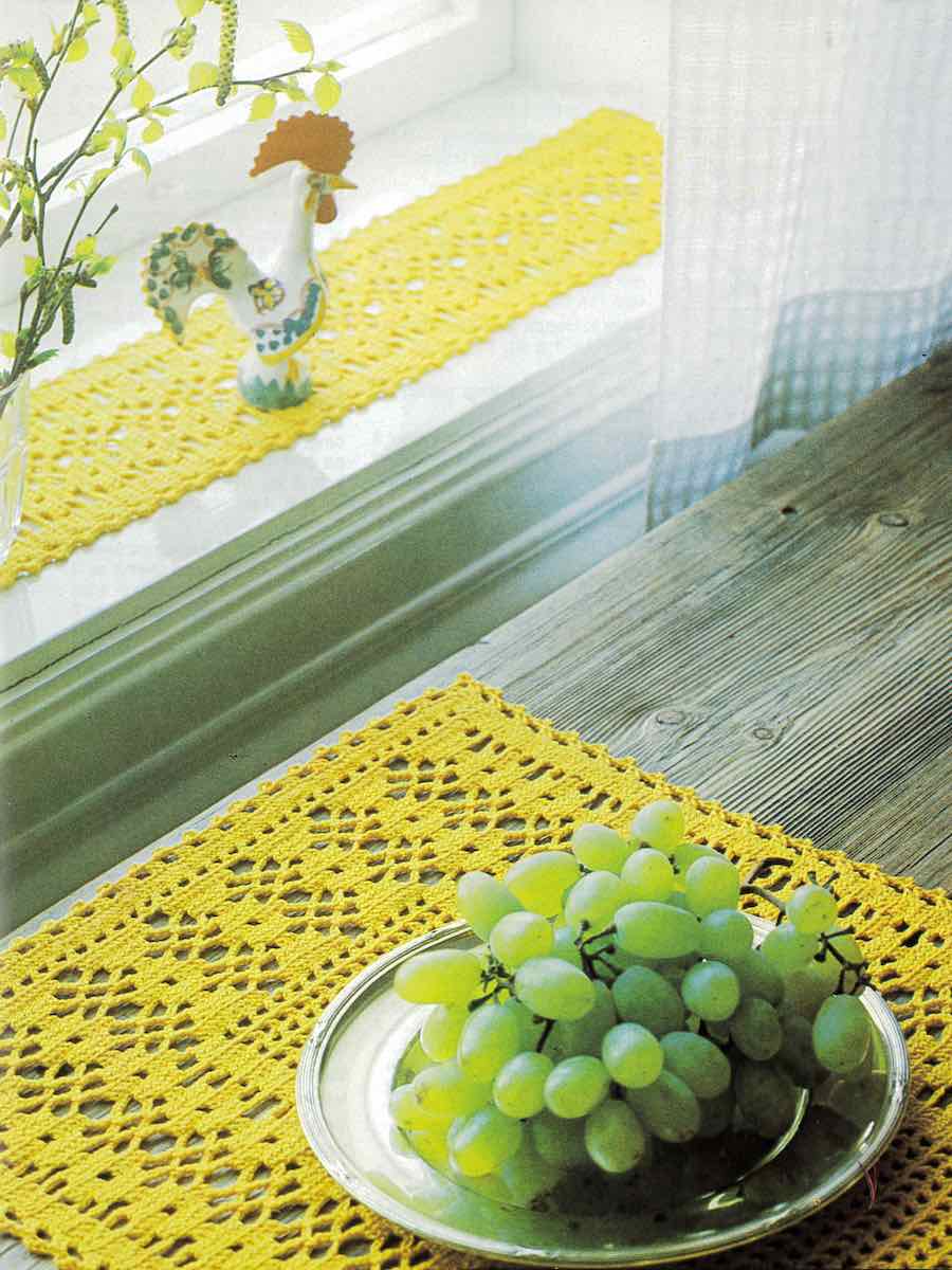 Tabletten hækles med luftmaskebuer og efter mønsteret i rækker med stangmasker, luftmaskebuer og picotmasker. Mønsteret gentages og udvides for hver række, indtil den ønskede størrelse er nået. Vinduesstrimlen hækles med en række luftmasker og hækles derefter efter mønsteret med stangmasker, luftmaskebuer og picotmasker for en luftig hulstruktur. Arbejdet vokser på langs med gentagne rækker. Afslut med en kant.