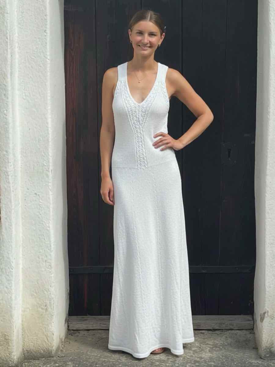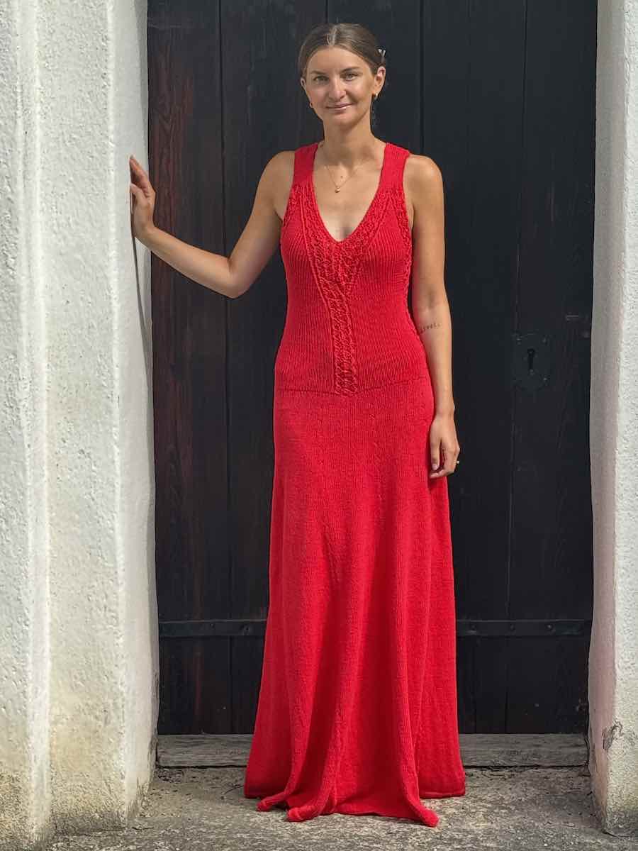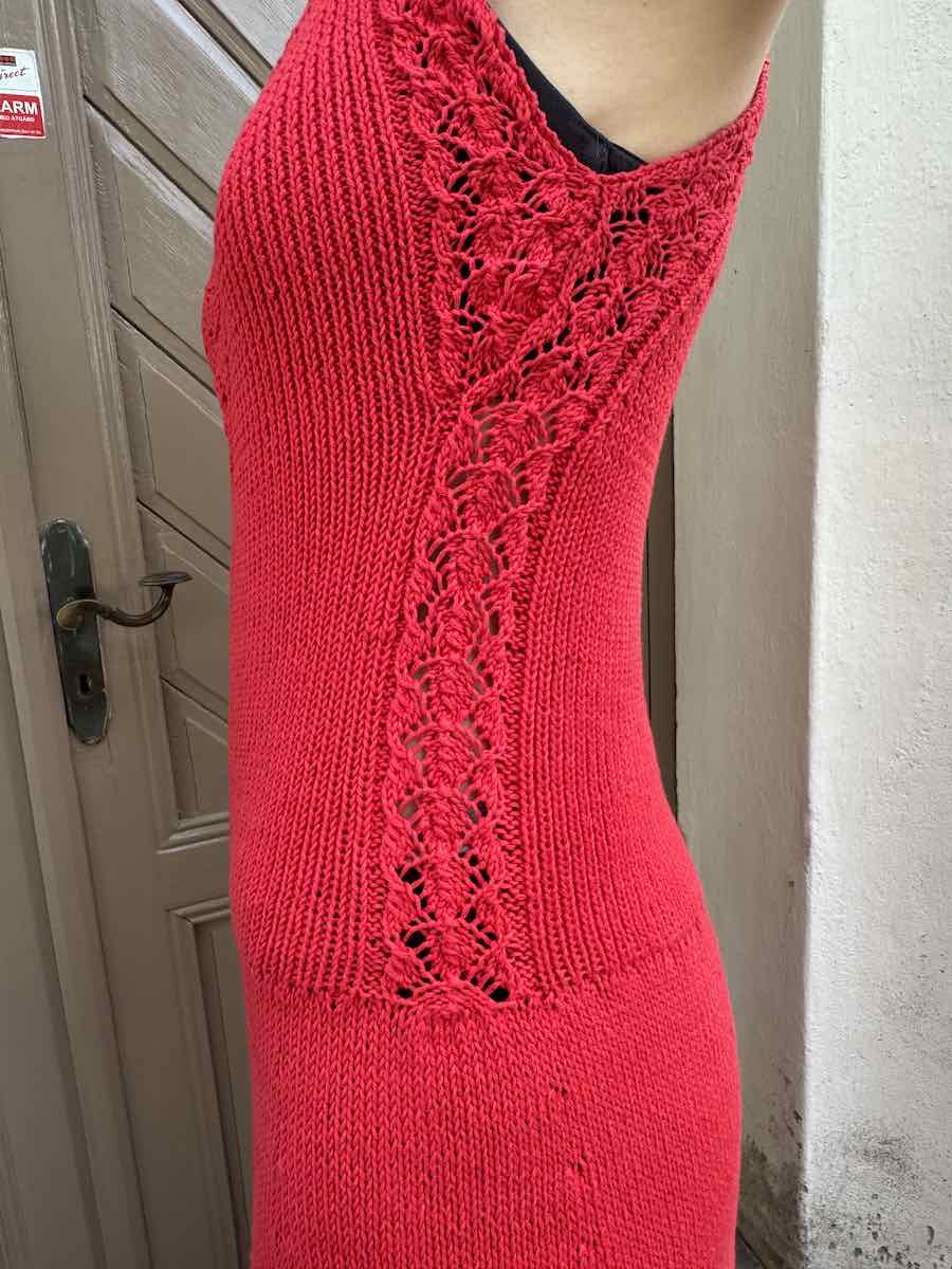 Elegant lang kjole i blondestrikning. Toppen er strikket nedefra og op, bunden er strikket oppefra og ned, og er formet med diagrammer og elastik.