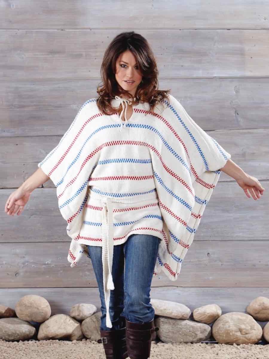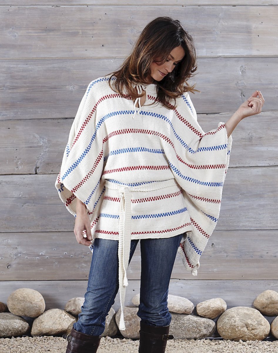 Ponchoen strikkes i glatstrik med elementer fra mønsteret ifølge diagrammet. Bagstykket og forstykket strikkes separat med huller til bæltet og en slids foran. Halsudskæringen formes med aflukningsmasker. Samles med sømme, hæklet kant og bælte.