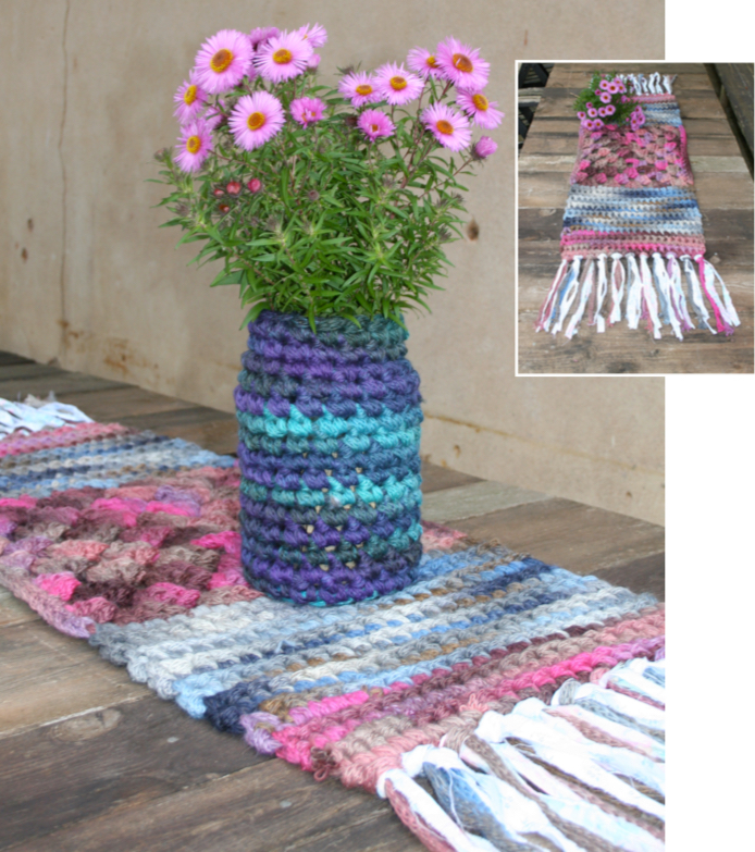 Tilbehør: Krukke ca. 25 cm høj, 42 cm rundt, 13 cm i bunden. Stoflister til dug/tæppe, ca. 10 m, 1,5 cm