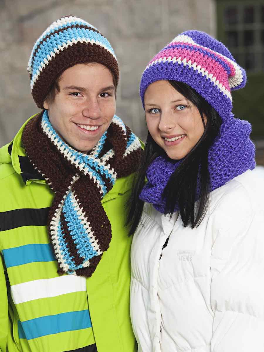 Sæt med hue , halstørklæde og polohalstørklæde . Huen hækles rundt i stangmasker og øges trin for trin for at få den rette form. Halstørklædet hækles frem og tilbage og har et dekorativt stribemønster i tre farver. Polohalstørklædet hækles som en ring og er beregnet til at blive viklet to gange om halsen. Alle dele afsluttes med fastmasker for en flot finish.
