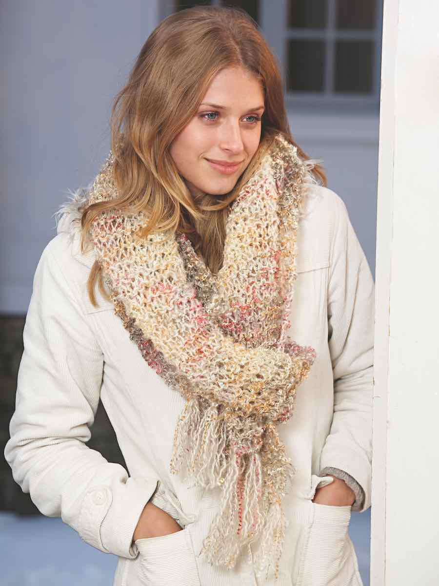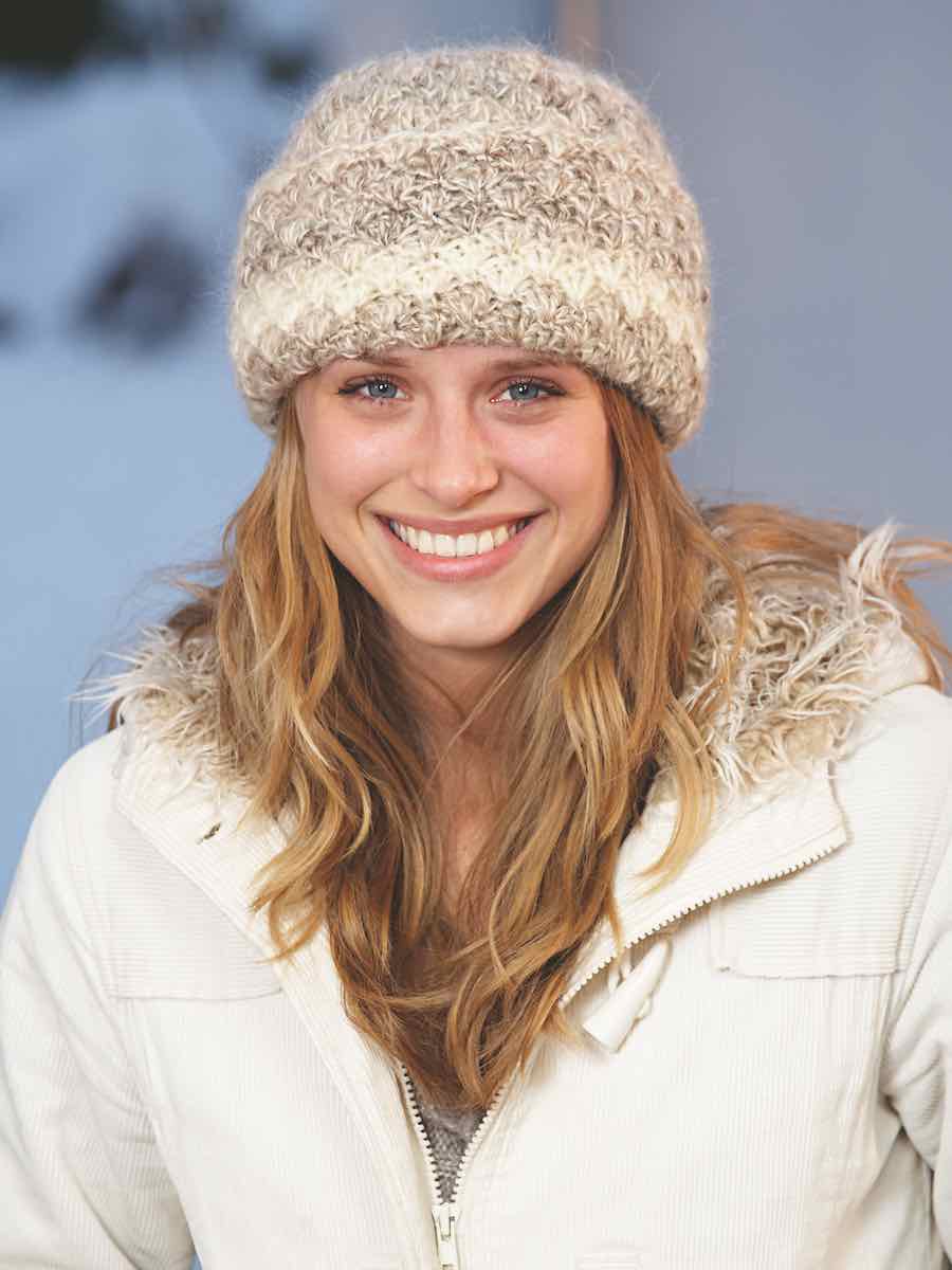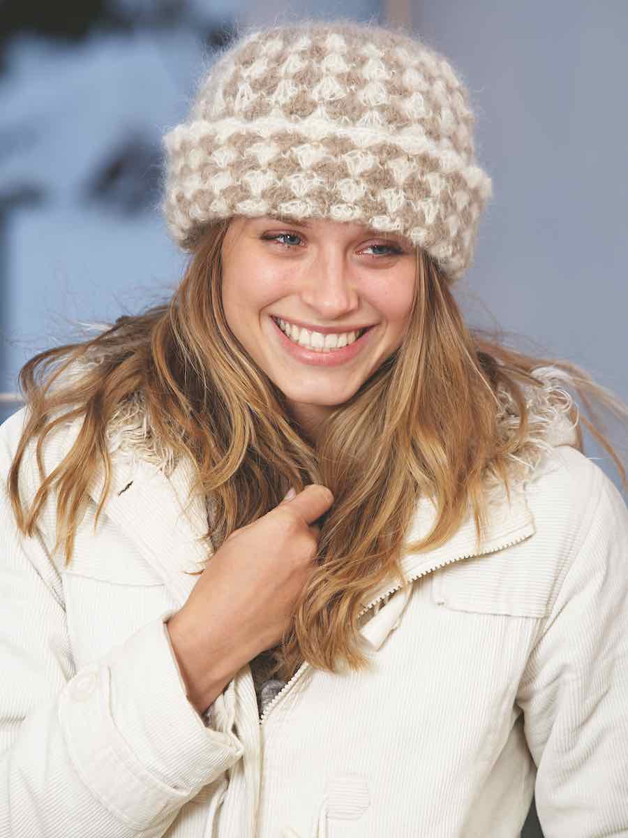 Hue og halstørklæde i hækling og strikning. Huen hækles ovenfra og ned i dobbeltmaskegrupper, der giver et levende mønster, mens halstørklædet strikkes i retstrik med to tråde for en luftig struktur.