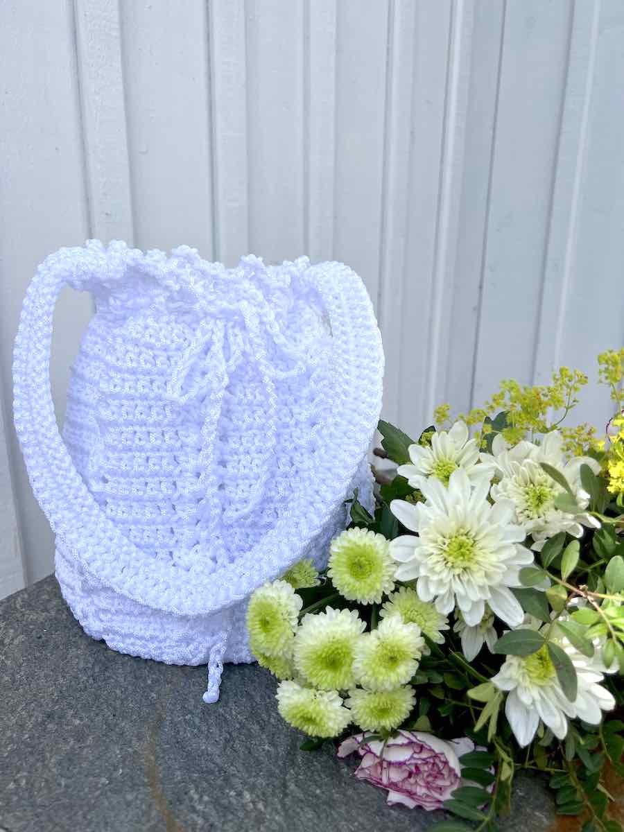 Sød taske med rund bund. Hæklet med stangmasker og et mønster der løber rundt.