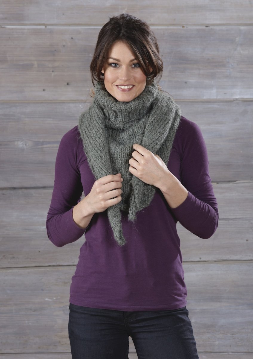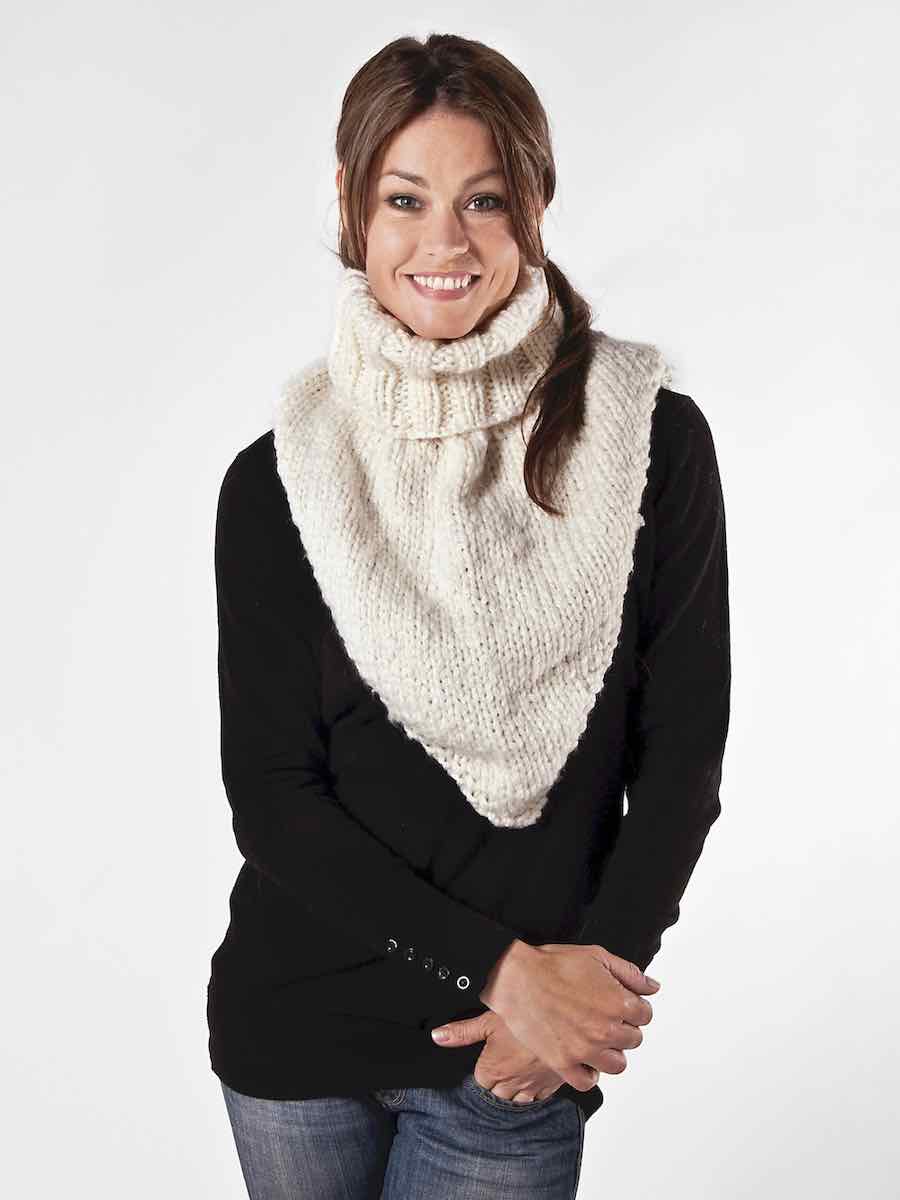 Stor sjalskrave strikket i glatstrik med udtagninger fra 4 masker og formet med indtagninger rundt om halsen. Strikket frem og tilbage på grove pinde i flerfarvet garn, med en afsluttende rib rundt om halsen.