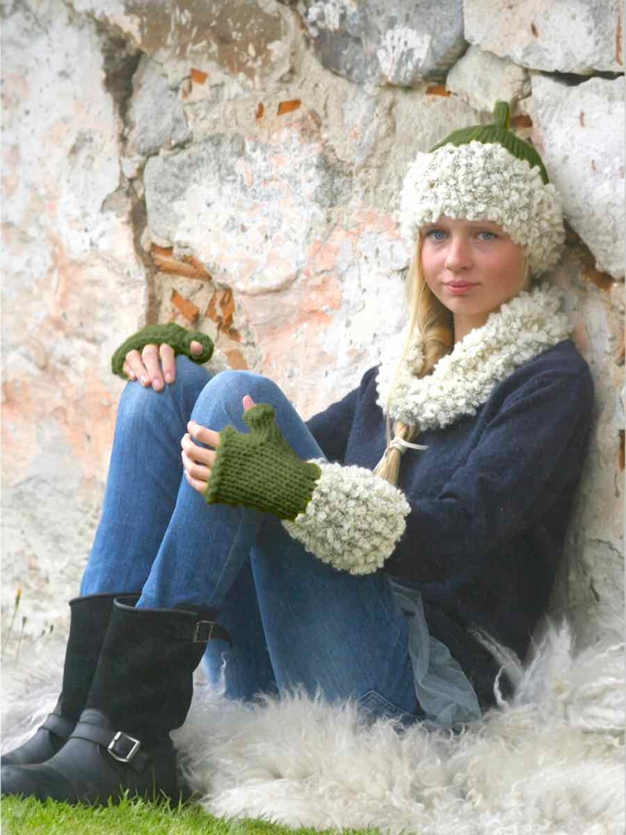 Strik hue, løkke og vanter. Brug rundpinde og strømpepinde med grov strikkefasthed. Glatstrik og enkle indtagninger.