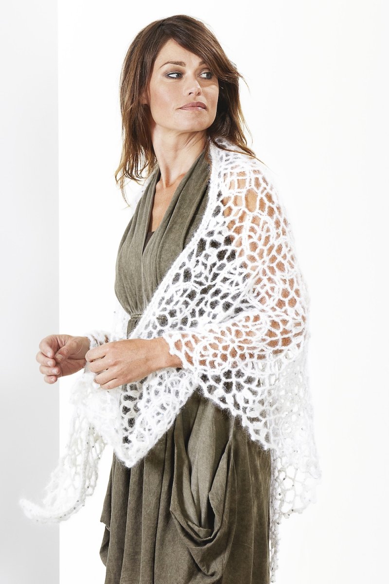 Dette elegante sjal er lavet af 15 hele firkanter og 6 halve firkanter, der er hæklet sammen en efter en for at skabe den karakteristiske trekantform. Hver firkant hækles i fem rækker med luftmasker, stangmasker og stangmasker sammen for at danne et dekorativt mønster. Når firkanterne er samlet, afsluttes arbejdet med en kant af fastmasker og dekorative picotmasker langs siderne.