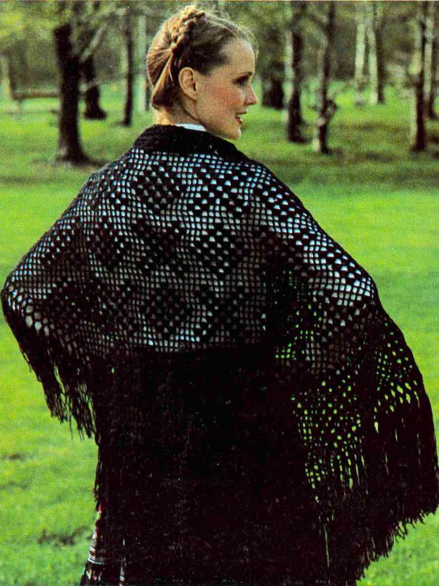 Luftigt sjal hæklet nedefra og op i et smukt hulmønster efter diagrammet. Arbejdet er formet med luftmaskebuer og stangmasker. Hækl i omgange med udtagninger. Afsluttet med frynser langs kanterne.