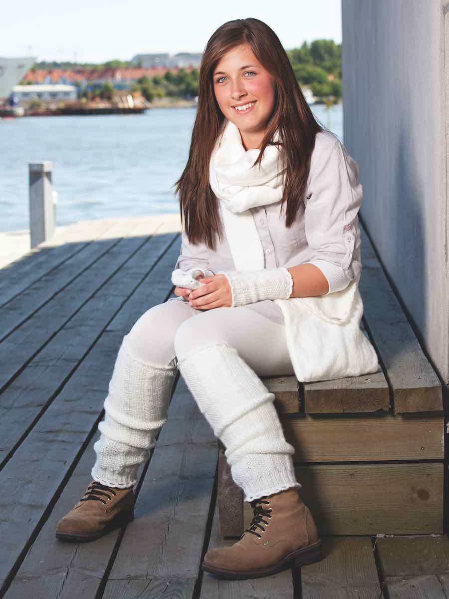 Sæt med skuldertaske, mobiltelefontaske, benvarmere og håndledsvarmere. Taskerne er strikket i glatstrik og retstrik, foldet og syet sammen, med hæklede kanter og knaplukning. Benvarmerne og håndledsvarmerne er strikket rundt i retstrik og glatstrik med ribkanter og hæklet afslutning.
