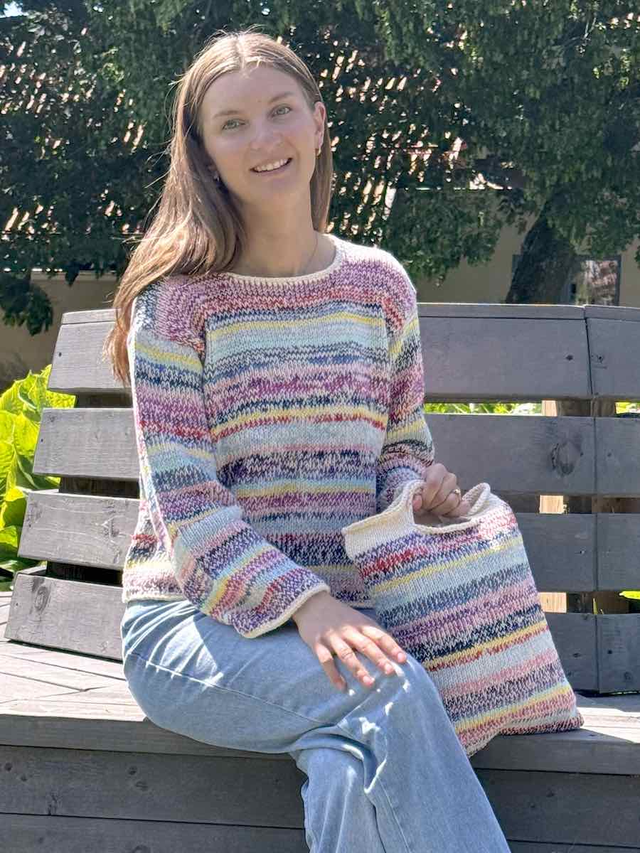 Konfettisweateren er strikket i farverige striber med varierende nuancer. Mønsteret er alsidigt og inkluderer både sweateren og den matchende taske.