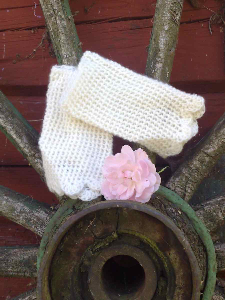 Håndledsvarmerne hækles rundt med fastmasker i forreste led for en elastisk struktur. Efter 11 cm hækles en tommelfingeråbning med luftmasker, derefter fortsættes der ligeud. Afslut med en hulkant i stangmasker og sy perlemorsknapper på.
