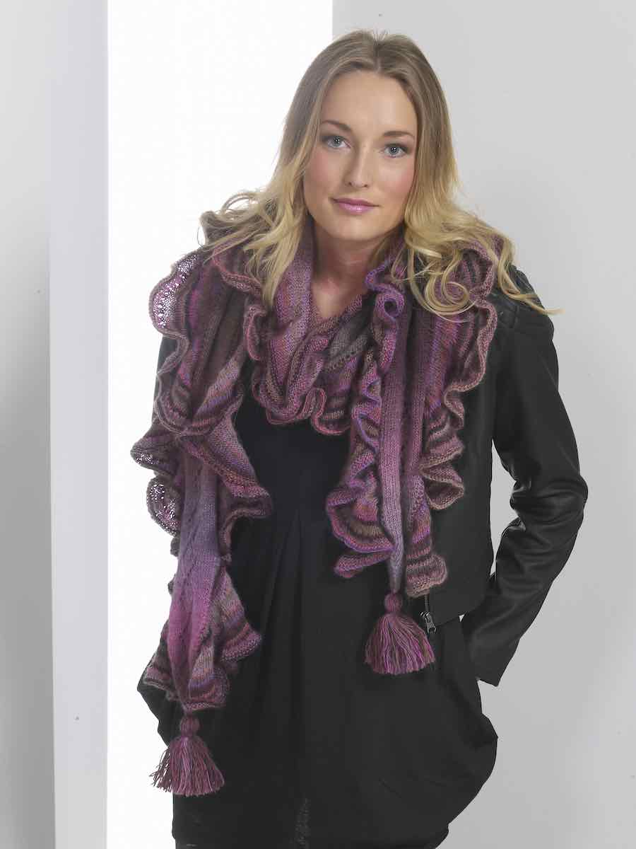 Halstørklædet strikkes i en midterdel med et mønster efter diagrammet. Langs siderne samles masker op, og der strikkes en flæse med udtagninger, hulkant og glatstrik. Afslut med kvaster i enderne.