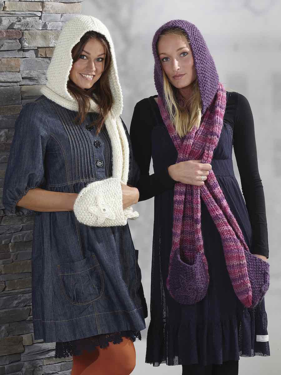 Strik et hyggeligt halstørklæde med hætte i uldgarn. Du strikker i glatstrik og retstrik, former lommer, syr en hætte og pynter med hæklede stjerner.