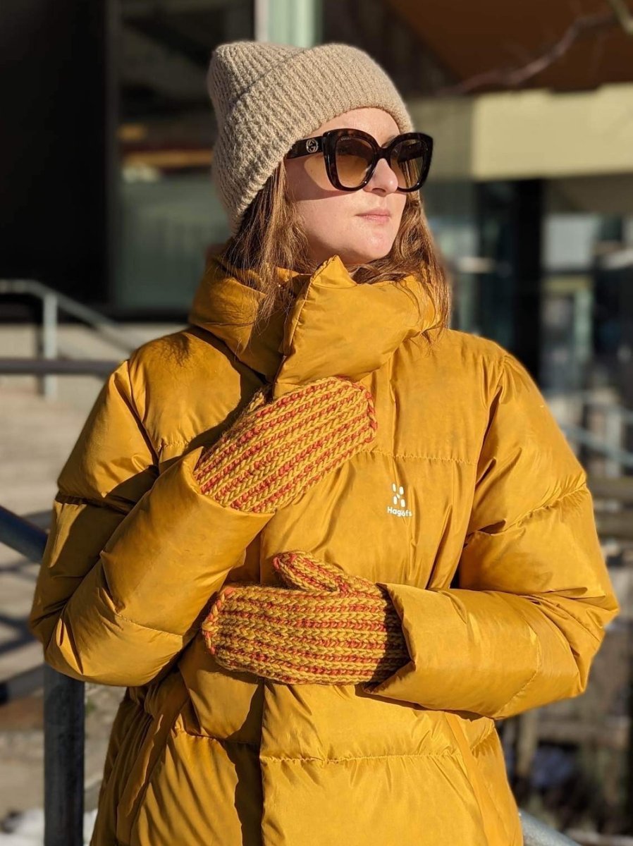 Dobbeltstrikkede vanter, der er strikket med 2 farver. Du strikker kun med én farve ad gangen.